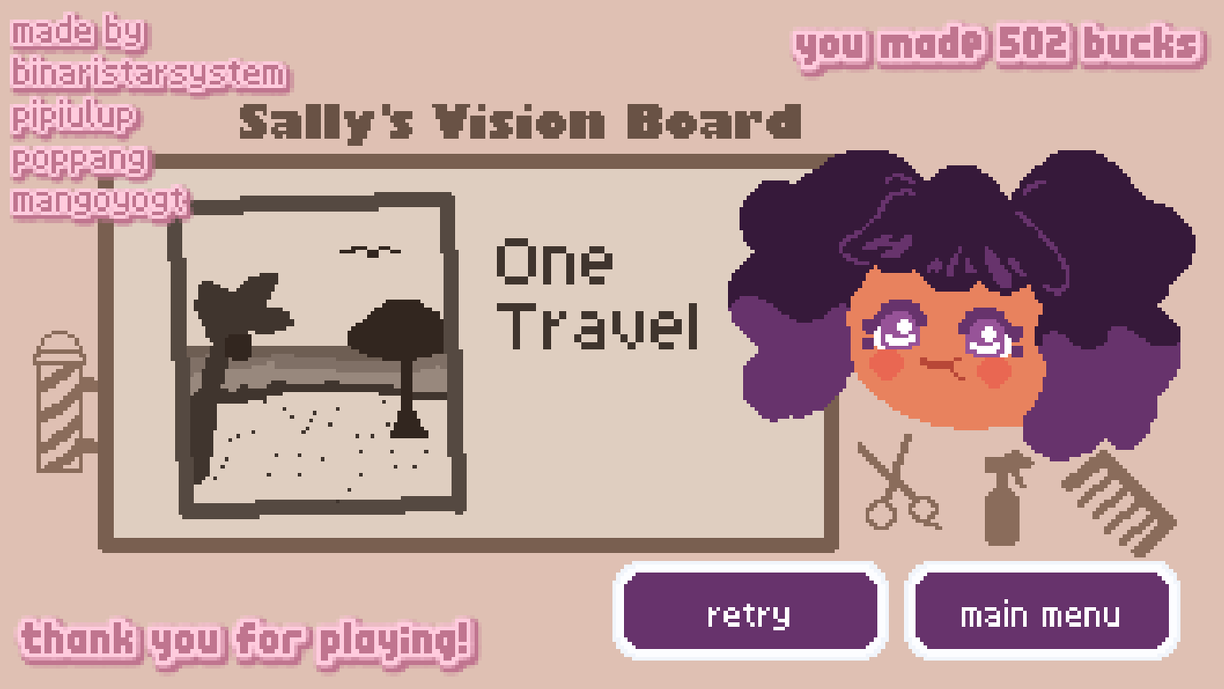 This is a Quick Time Event (QTE) game where your goal is to earn enough money to go to a vacation by typing the right answers in time while your clients' hair seems to never end!